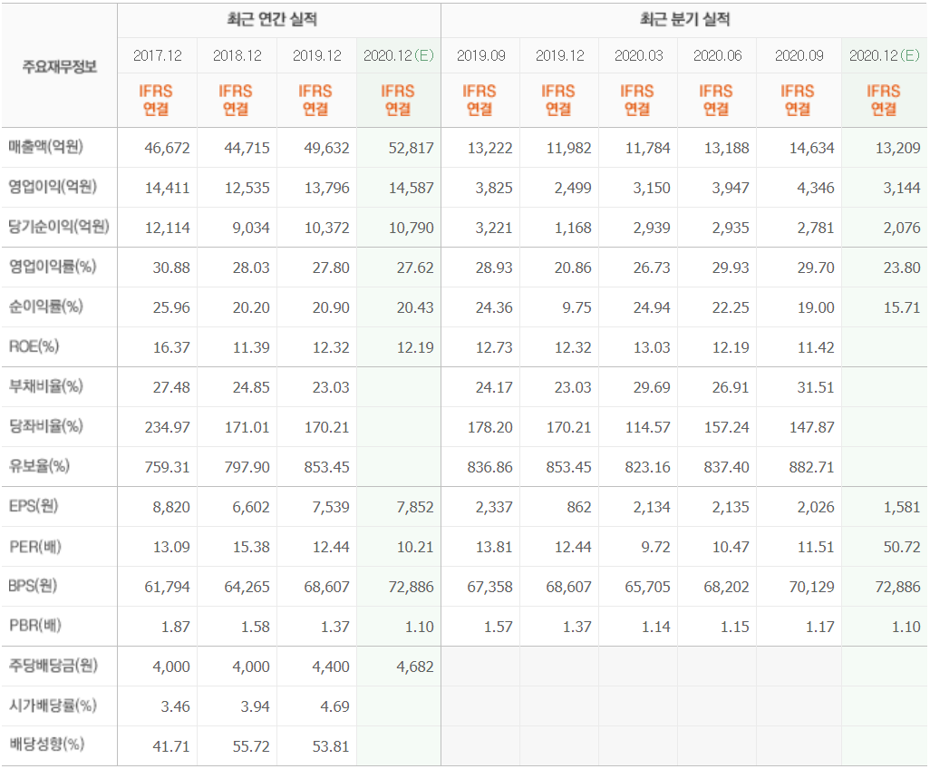 최근 3년간의 실적을 보면 연매출이 평균 4조 7천억원에 영업이익도 평균 1조 3천억 원이 됩니다. 30%에 육박하는 영업이익률과 12%대의 ROE를 보여주는 놀라운 기업입니다. 작년 2020년 실적을 살펴보면 역대급 실적을 보여주었습니다.