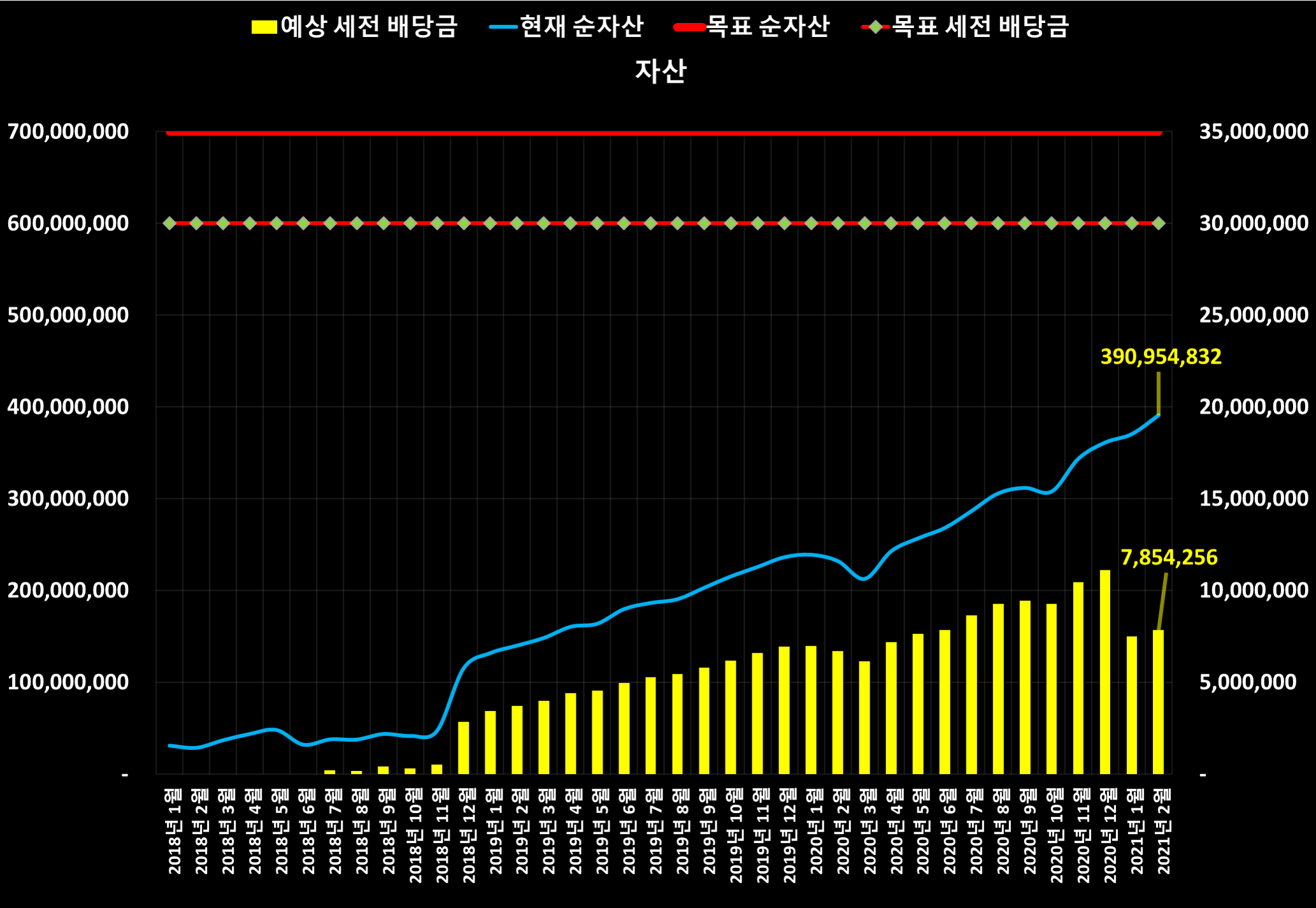 현재까지 순자산은 약 3억 9천만원으로 예상보다 빨리 성장하고 있습니다. 목표 금액은 7천만 원에 세전 예상 배당금은 3천만 원으로 예상하고 있습니다. 빨리 이룰 수 있도록 더욱더 돈에 관심을 가지고 살아야 할 것 같습니다.