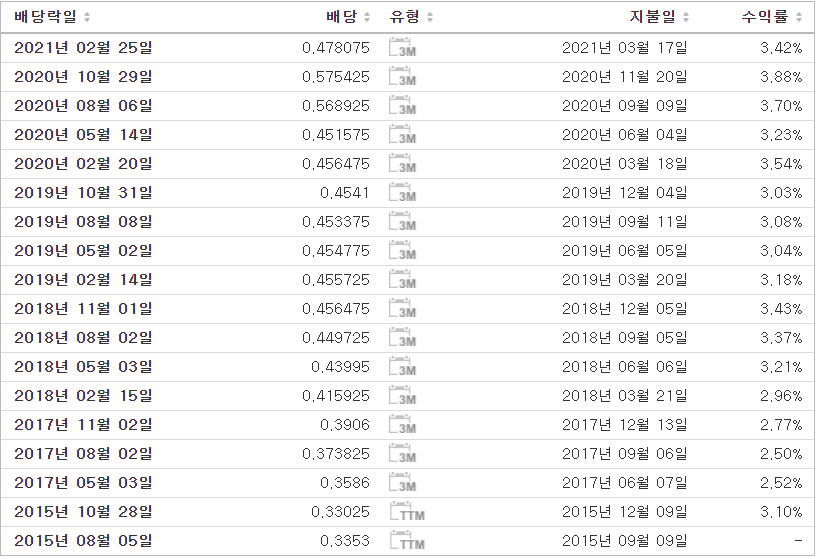 시가 배당률은 4.18%로 배당금 위주의 투자에서 아주 훌륭한 수치입니다. 거기다가 배당금도 계속 상승 중이니까요.