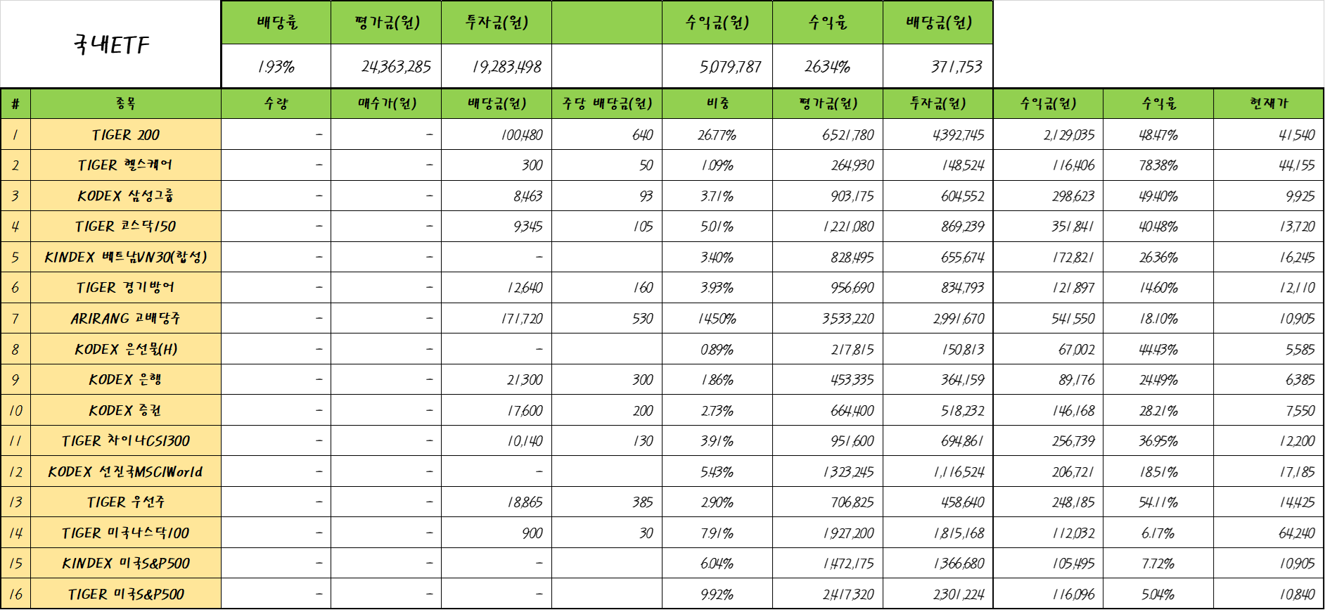 국내 ETF는 16 종목으로 구성되어 있습니다. 크게 나누어보면 연금계좌, 증여용 계좌 그리고 ETF 전용 계좌로 나눌 수 있습니다. 연금계좌에서 펀드를 사는 것보다는 ETF가 조금 더 저렴한 수수료로 운용할 수 있기 때문입니다. 증여용 계좌는 미래의 자녀에게 증여하기 위해 매달 20만 원씩 ETF를 모아가는 계좌이고요.