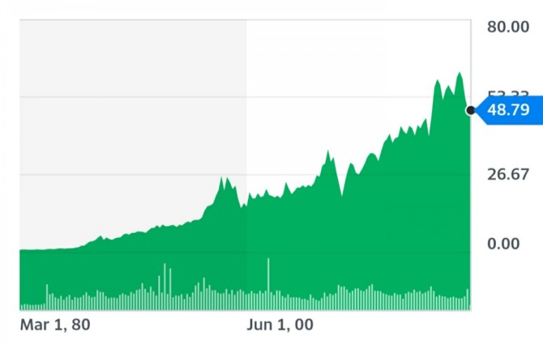 40년간 차트를 가져와 봤는데요. 거의 1달러짜리가 48불이니 48배 올랐어요 ㅋㅋ 생필품 회사라도 주가가 기술주에 밀리지 않아요.