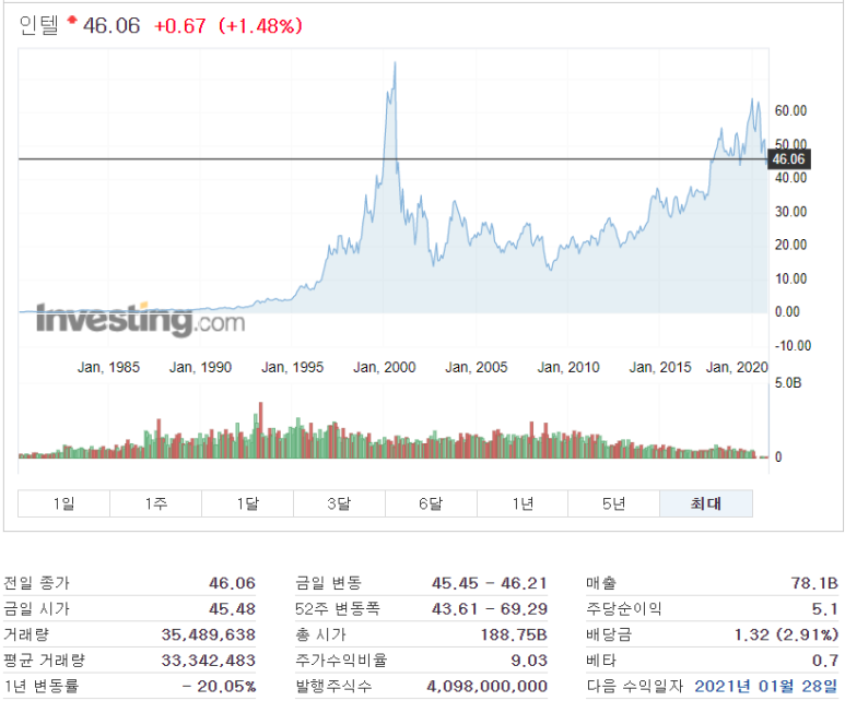인텔은 다시 주가가 올라가기 시작했어요. 인텔의 저력을 보여주세요. 외계인을 고문했으면 지구인은 이겨야지요.