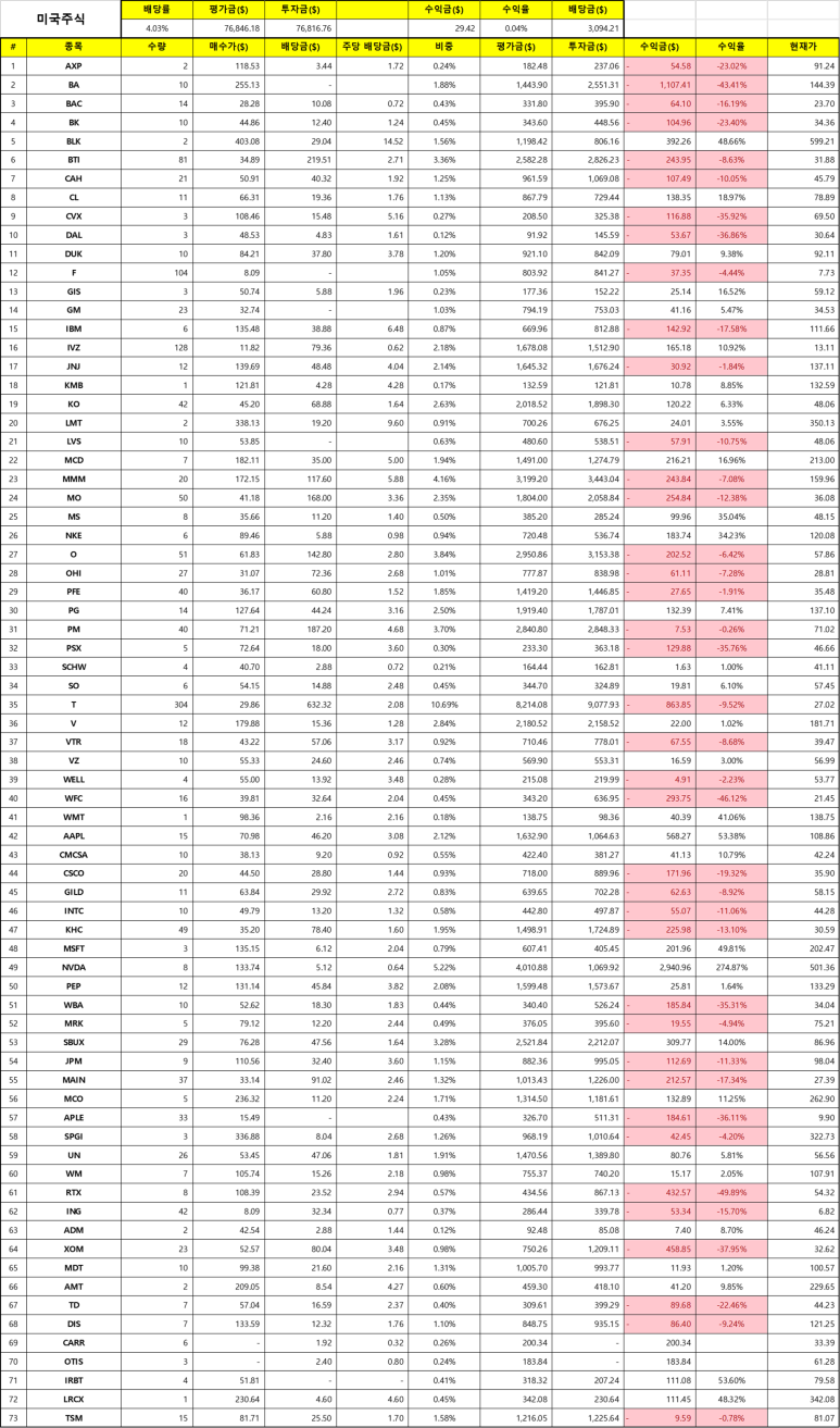 GM과 마찬가지로 내년에나 배당을 기대해 볼 만하고 현재 주가가 심하게 하락해서 시가 배당률이 많이 올라가 있어요. 그러다 보니 기업의 입장에서 배당금을 삭감할 수도 있겠다 싶군요. 물론 시가 배당률이 올랐다고 해서 삭감하는 건 아니지만 주가도 하락하고 실적도 하락하면 시가 배당률을 이때가 기회다 싶어서 낮출 수도 있지 않을까 생각해 봅니다.