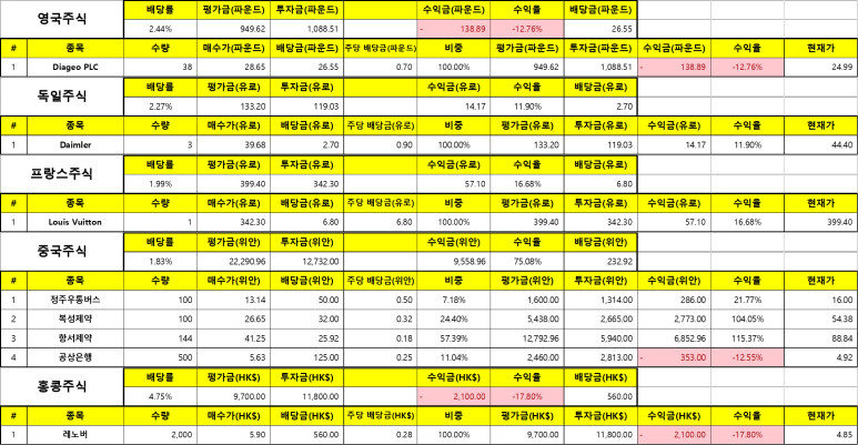 마지막으로 여러 나라에 조금씩 투자하고 있는 포트폴리오입니다. 전 세계의 술을 대표하는 기업인 디아지오, 자동차로 유명한 다임러그룹(벤츠), 명품계의 선두주자인 LVMH(루이비통), 노트북계의 대중화를 이룬 레노버이지요. 중국 주식도 조금 있네요. 제약회사와 은행, 그리고 전기차 버스를 만드는 정주우통버스입니다.