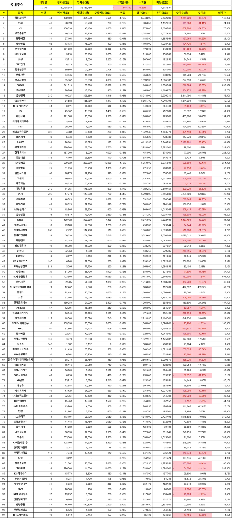 먼저 보유 중인 국내 주식을 살펴볼게요. 배당금 재투자를 반영했을 때 수익률은 현재까지 -1.26%로 마이너스인 상태이고요. 예상되는 연간 배당금은 490만 원 정도 됩니다. 10월까지 가장 높은 수익금을 기록하고 있는 주식은 뭐니 뭐니 해도 삼성전자입니다. 우선주와 보통주 합쳐서 약 560만 원 정도의 수익금이네요. 삼성전자의 수장인 이재용의 능력을 믿고 오랫동안 가져가 보렵니다.