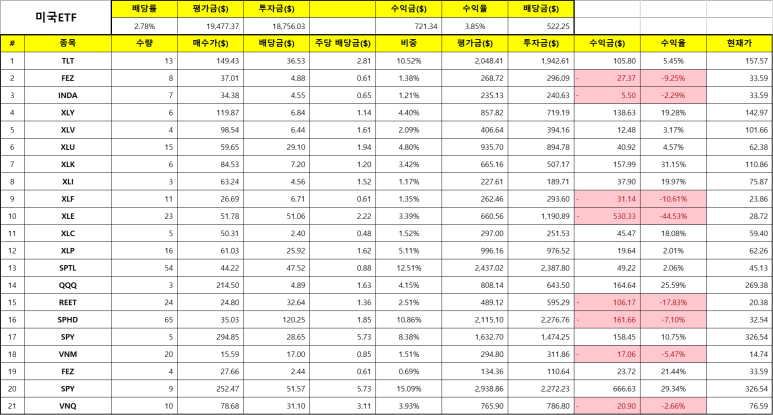 제 포트폴리오에서 가장 큰 비중은 SPY이고 그다음은 미국 정부의 장기 채권에 투자하고 있는 TLT와 SPTL, 그리고 배당금을 채워주는 SPHD입니다. 더 이상의 종목 추가 없이 계속 추가 매수해서 투자금을 높여야겠어요.