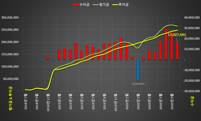 2018년 7월부터 현재까지 흘러온 자취를 한눈에 볼 수 있는 그래프인데요. 3월 코로나의 힘은 역시 대단했네요. 지하실까지 내려간 차트는 한 달 만에 다 회복이 되었지요. 진짜 예측이라는 것이 불가능하다는 것을 이번에 제대로 배웠습니다.