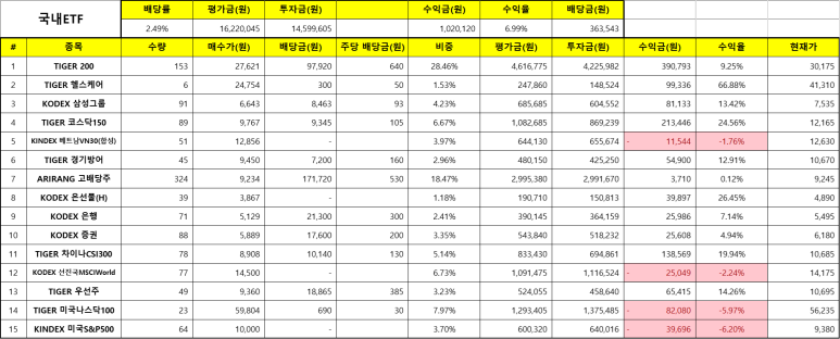 생각보다 개별 주식보다 높은 수익률이라 움찔했네요. 역시 이 손은 똥 손인가 싶어서요. 약 7%의 수익률입니다. 예상되는 연간 배당금은 36만 원이고요. 주력은 TIGER 200과 ARIRANG 고배당주입니다. 아무래도 지수 추종과 부족한 배당금을 채워주는 역할이라고 할까요? 미국 주식도 마찬가지로 TIGER 미국S&P500과 KINDEX 미국나스닥100 그리고 배당 ETF를 넣고 싶으나 막상 국내에 상장된 해외 주식형 ETF 중에서 배당을 위한 ETF가 보이지 않네요.