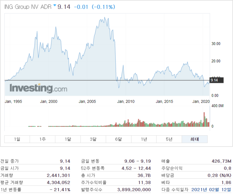11월 11일 또 하나의 주식을 매도했네요. 매도한 기업은 네덜란드의 금융회사인 ING Group이에요. 약 2년 좀 안되게 보유했던 종목이라 애착이 갔는데 사고 싶은 기업들이 워낙 많다 보니 비중이 낮은 기업 위주로 선택하여 얘로 택하게 되었지요.