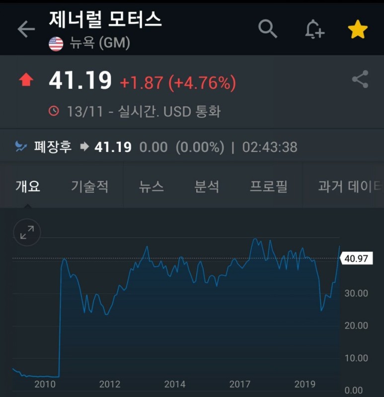 현재 제너럴 모터스의 주가는 신고가 근처까지 간 상태로 하락은 거의 다 복구되었어요.