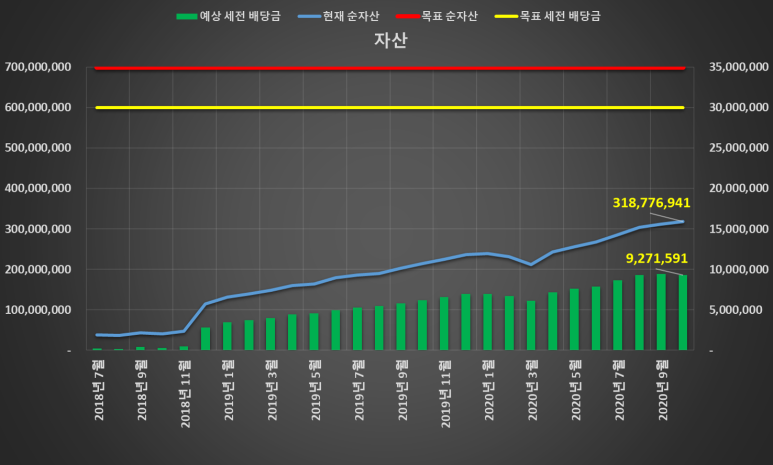 이번 그래프는 순자산과 배당금에 대한 것인데 경제적 자유를 위해 필요하다고 생각하는 목표 순자산과 목표 세전 배당금을 얼마나 이루어나가고 있는지를 살펴보겠습니다. 제 기준에서 작성한 그래프이니 사람마다 다를 수 있습니다.