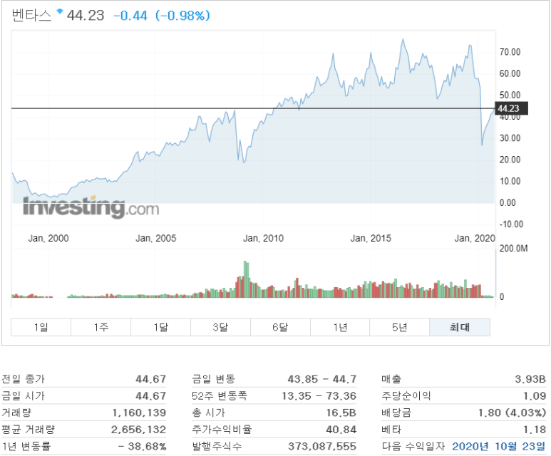 - 여전히 주가는 박스권에서 머물고 있네요. 매년 90억 파운드의 영업이익을 올리고 있으나 주가는 전혀 반영을 못 받고 있어서 저렴한 가격대를 유지하고 있습니다. 실적이나 큰 이슈도 없지만 주가가 오르지 않는다면 오히려 기회라고 볼 수 있겠죠. KT&G, 필립 모리스, 알트리아 모두 비슷한 주가 형태를 띄는 것을 보면 특정 기업에 관한 문제가 아닌 전체적인 산업군이 인기있는 기술주에 비해 큰 인기를 얻지 못하는 것이 주가하락의 원인이라고 봅니다.