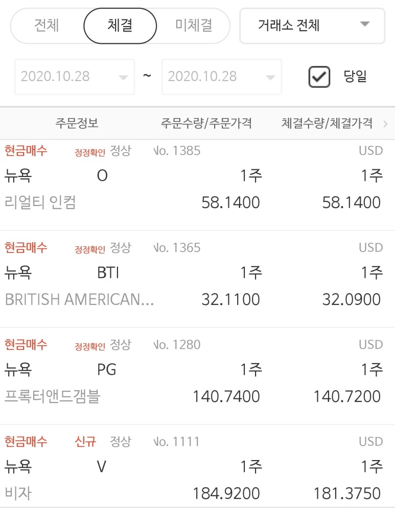 10월 28일도 주식을 조금 매수해 보았어요. 리얼티 인컴(O), 브리티시 아메리칸 타바코(BTI), 프록터 앤 겜블(PG), 비자(V)를 각각 1주씩 매수했는데 프록터 앤 겜블을 제외하고는 저렴한 가격대였습니다. 비자가 계속 하락하고 있어서 또 담고 싶은데 아직은 월급날이 좀 많이 남아서 아쉽네요. 조금만 더 기다려 주었으면 하는데 과연 생각대로 될까요?