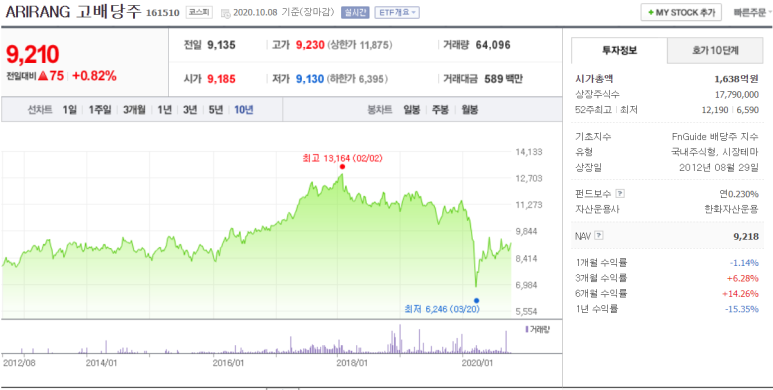 2. ARIRANG 고배당주 - 시가총액 1,638억 원, 수수료 0.23%, 국내 주식형