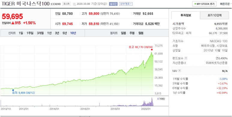5. TIGER 미국나스닥100 - 시가총액 4,955억 원, 수수료 0.49%, 해외 주식형