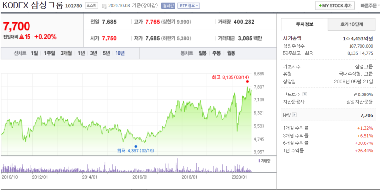 4. KODEX 삼성그룹 - 시가총액 1조 4,453억 원, 수수료 0.25%, 국내 주식형
