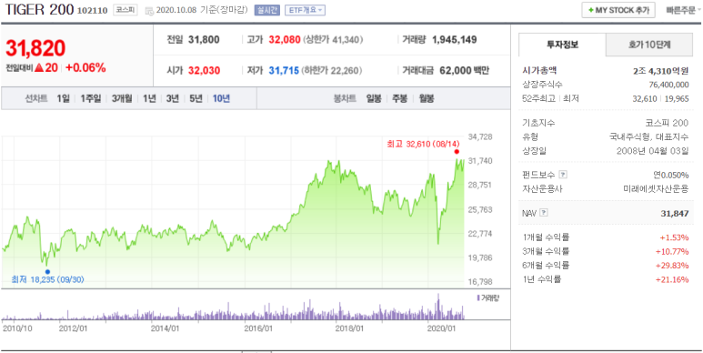 3. TIGER 200 - 시가총액 2조 4,310억 원, 수수료 0.05%, 국내 주식형