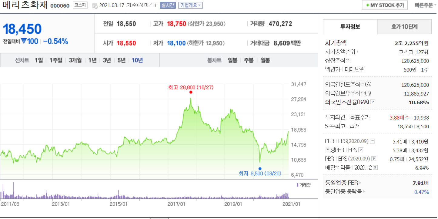 저는 맥도날드의 배당금과 지난 배당금들로 메리츠화재를 10주 담아보았습니다. 약 18만 5천 원 정도를 샀는데 이 10주의 메리츠화재가 다시 내년에 12,800원의 배당금 지급할 예정입니다. 정말 놀랍지 않나요? 그렇다면 메리츠화재는 주가가 성장하고 있는지 살펴보아요.