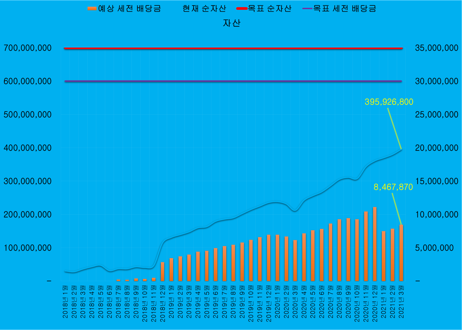 현재까지 순자산은 약 3억 9천만원으로 예상보다 빨리 성장하고 있습니다. 목표 금액은 7천만 원에 세전 예상 배당금은 3천만 원으로 예상하고 있습니다. 빨리 이룰 수 있도록 더욱더 돈에 관심을 가지고 살아야 할 것 같습니다.