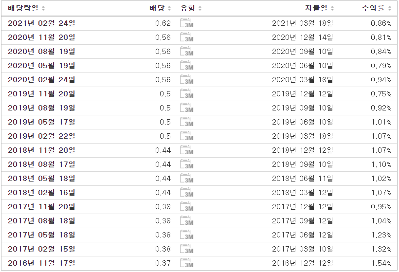 시가 배당률은 4.18%로 배당금 위주의 투자에서 아주 훌륭한 수치입니다. 거기다가 배당금도 계속 상승 중이니까요.