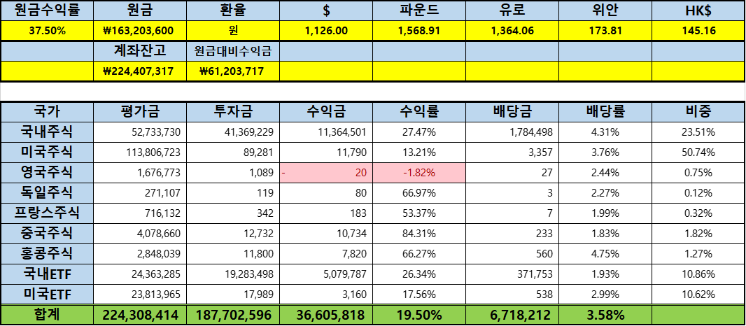 2018년부터 현재까지 주식투자를 하고 있는데 수익률은 37.5%를 기록하고 있습니다. 예상보다는 훨씬 좋은 수익을 얻고 있어서 기쁘네요. 물론 투자원금을 일부 회수했기 때문에 수익률이 올라가 있는 상태입니다. 투자원금을 회수하지 않았더라면 수익률은 약 25% 정도입니다. 그래도 나쁘지 않은 수익률이네요. 저처럼 종목수가 많은 분들을 잘 아실 텐데 시장보다 덜 오르고 시장보다 덜 빠지는 포트폴리오가 시장이 쑥쑥 오를 때는 후회도 드는 계좌이나 하락장에선 뿌듯한 계좌가 됩니다. 그리고 아무래도 배당률을 높게 구성한 포트폴리오이기 때문에 수익률은 조금 더 떨어지는 편입니다. 저는 약 2년 후 조기 은퇴를 꿈꾸기 때문에 배당률을 조금 높게 설정했어요.