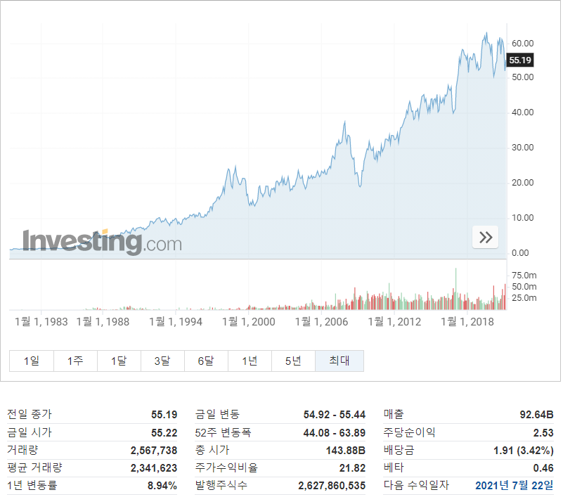 유니레버의 주가는 꾸준하게 상승하고 있습니다. 현재 약 55달러의 주가를 형성하고 있는데요. 아직까지는 수익 대비 약 21배의 평가를 받고 있고 큰 이슈도 없고 잘 흘러가고 있다고 판단할 수 있는 기업이라고 봅니다. 매수하는데 별 문제는 없어 보여서 앞으로도 계속 매수해서 유니레버의 주주로 살아가 보렵니다. 시가 배당률도 나쁘지 않네요. 3%대 배당률에 21배의 평가라면 충분히 매력 있잖아요.