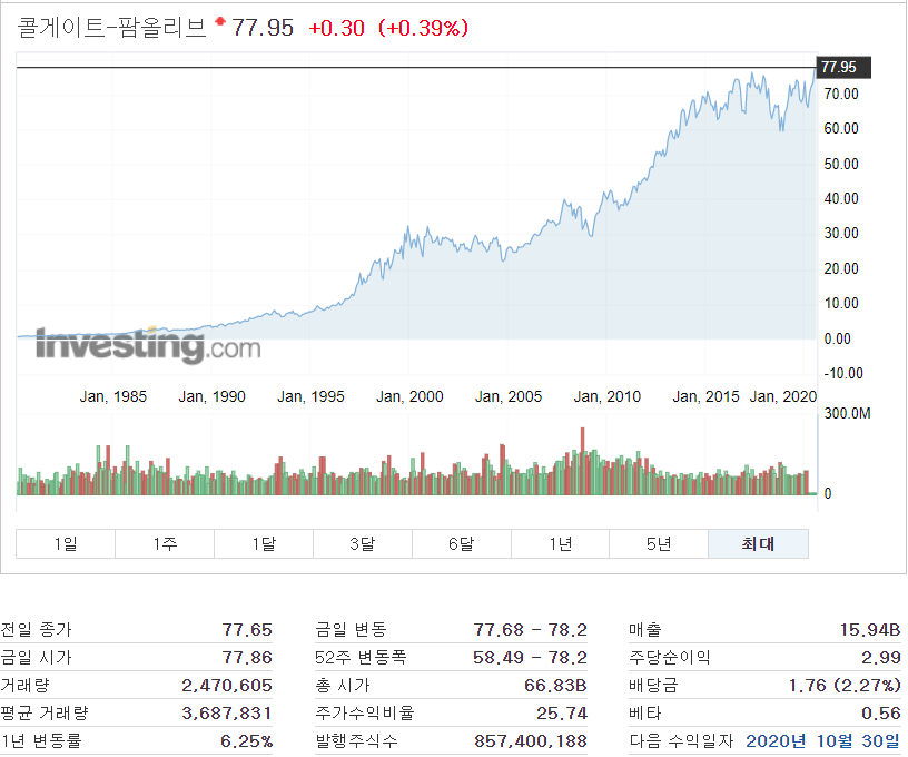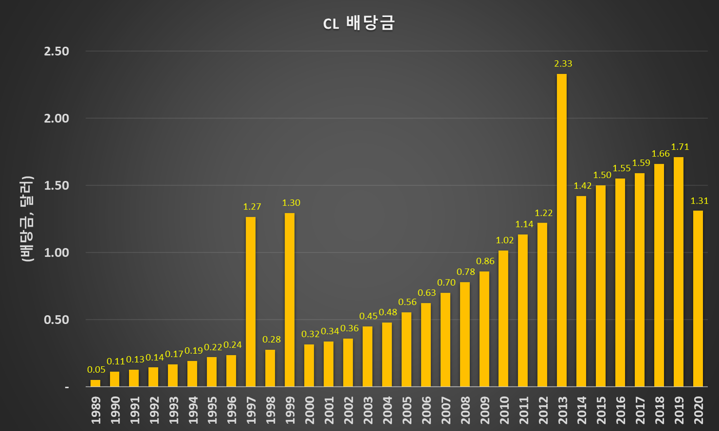 아직 EPS대비 60%의 배당성향으로 배당금을 지급하기 때문에 배당금 지급여력은 충분하고 당연히 배당금 삭감은 없을 것이라 믿어 봅니다. 그리고 콜게이트 팜올리브는 56년째 배당금을 증가시키고 있기 때문에 미국에서는 배당킹이라고 불리죠.