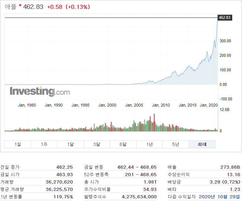 애플이 미쳤네요. 주가가 460달러를 넘어간 것도 모자라 시가총액이 2조 달러가 되었어요. 한화로 약 2,400조입니다.