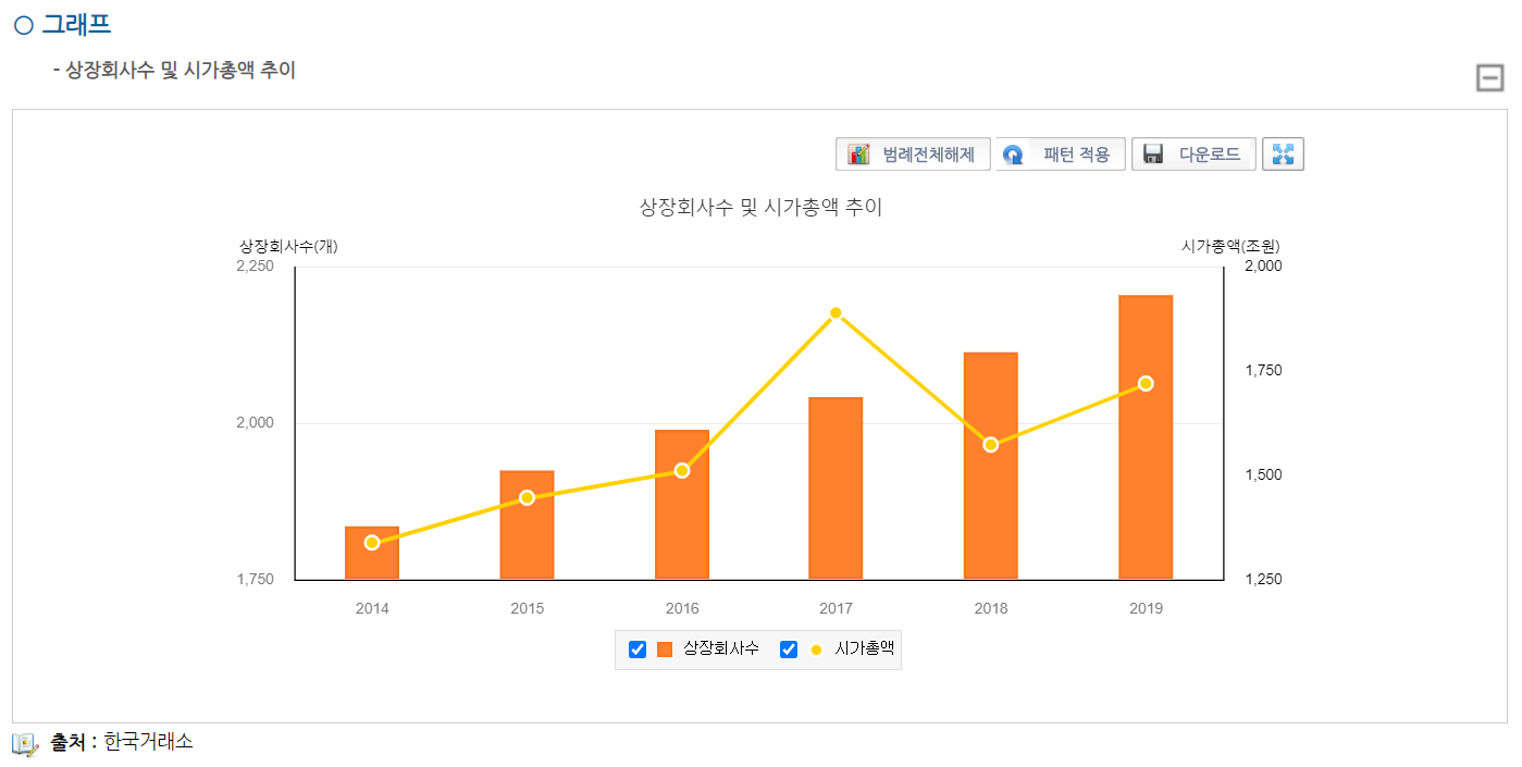 코스피와 코스닥 2019년 말 기준 약 1,700조