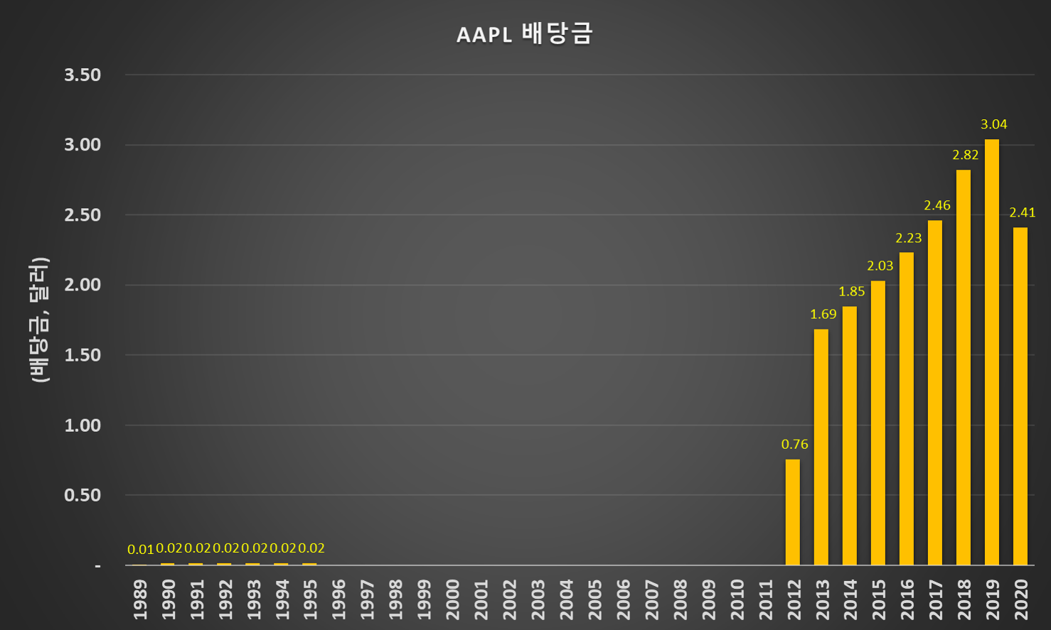 그러다가 스마트폰으로 엄청난 수익이 나면서 2012년부터 배당금을 지급하기 시작해요. 저 때 순이익이 이미 500억 달러를 넘었어요.