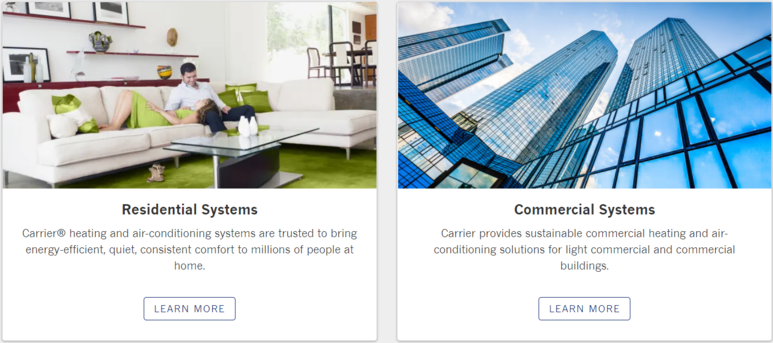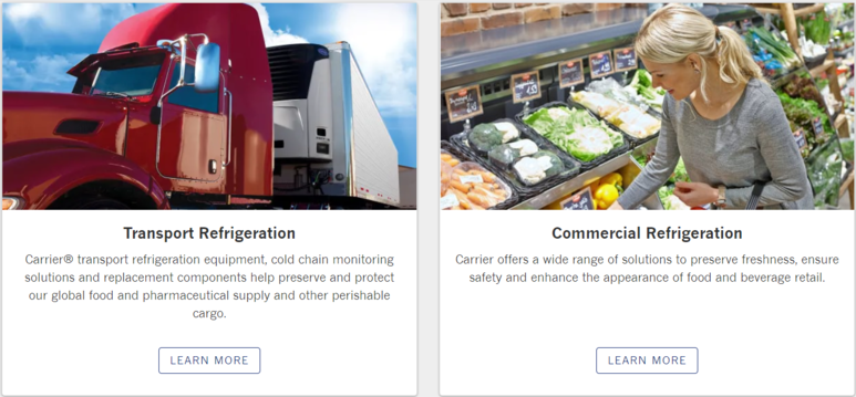 사업영역은 크게 4가지로 나눌 수 있어요. 가정용 냉난방 시스템, 상업용 냉난방 시스템, 냉장 & 냉동 탑차, 상업용 냉장고입니다. 우리에게 익숙한 캐리어 에어컨이라든지 캐리어 냉장고도 만들죠.