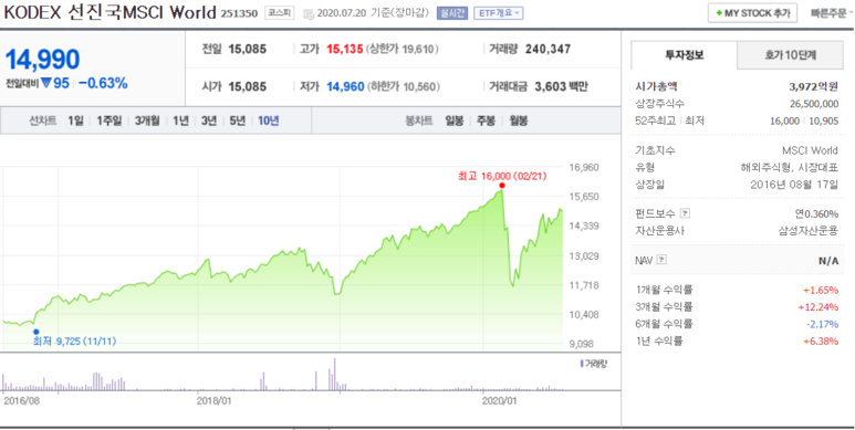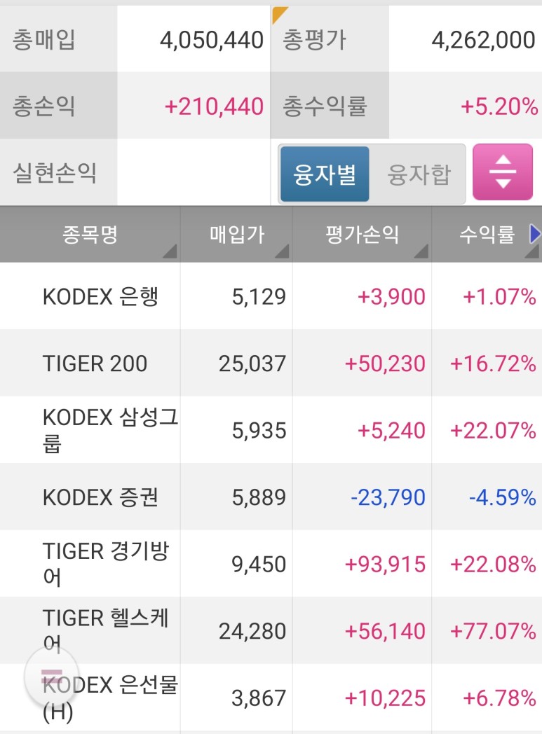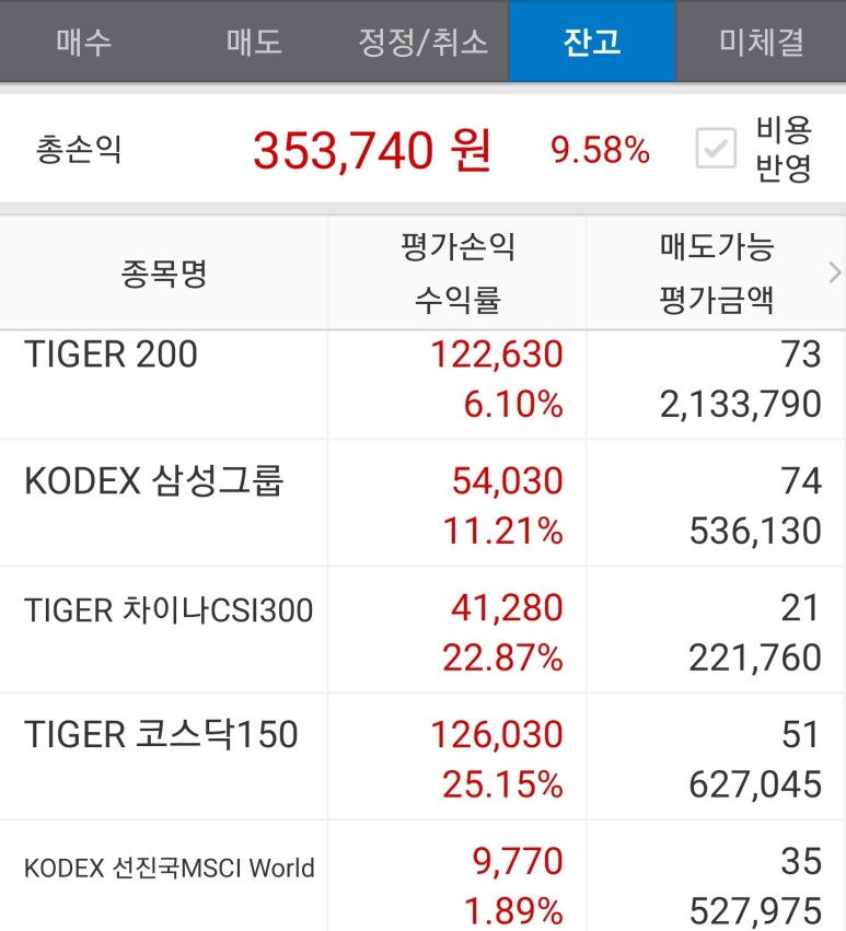 개인연금 계좌는 참고로 만 55세에 찾아서 쓸 돈이니까 20년 이상 시간이 있기 때문에 솔직히 몇 백 원 몇 천 원 비싼 건 의미가 없는 듯해요. 그 이유는 TIGER200과 KODEX선진국MSCIWorld는 당연히 성장성을 기대하고 담는 것이니까 내가 얼마나 주워 담느냐가 중요하지 지금의 수익률은 별로 의미가 없을 거라고 생각합니다.