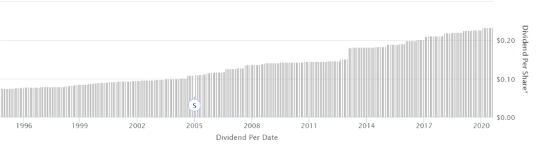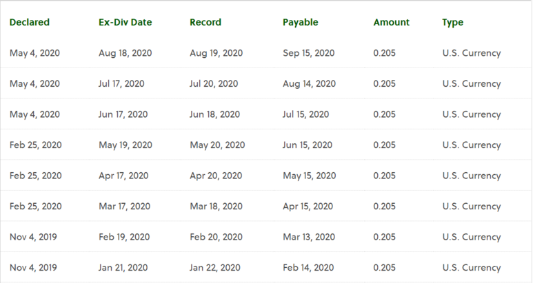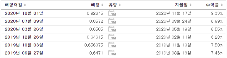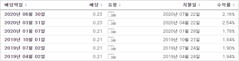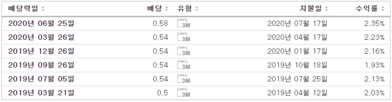 이번 2분기 배당금은 0.54달러에서 0.58달러로 약 8%가량 상승한 배당금이 지급되었어요.