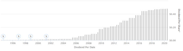 오랜 기간 꾸준하게 주가가 상승하고 있고 있어요. 약 40년간 주가가 0.5달러에서 현재 약 100달러까지 200배 정도 상승했습니다. 엄청나게 올랐어요. 앞으로도 더 오르겠죠? 제발 그래 줬으면 합니다 ㅋㅋ