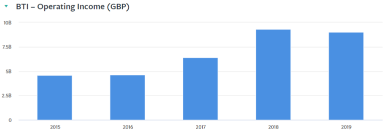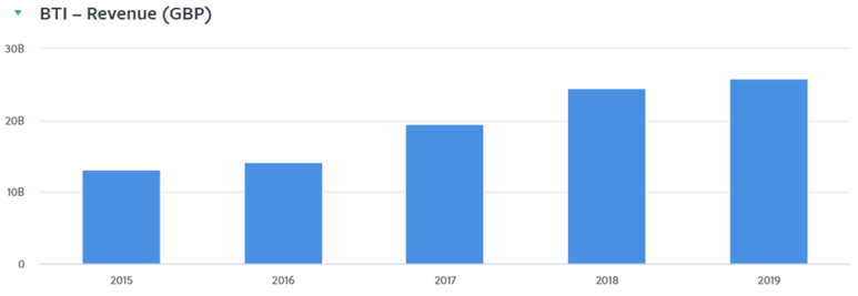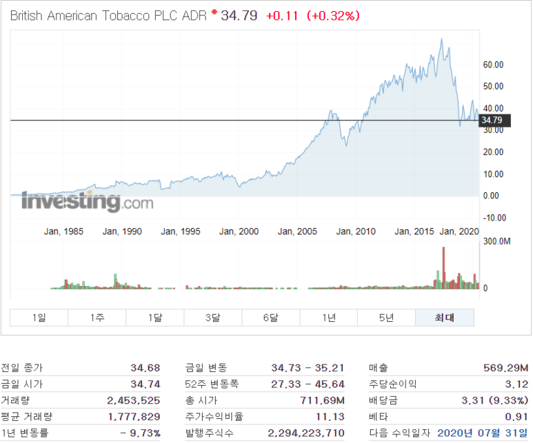 매출과 영업이익이 매년 꾸준하게 상승하고 있고요. 담배 팔아서도 돈을 엄청 벌어요. 250억 파운드면 대략 38 조가량 연간 매출을 발생시켜요. SK하이닉스가 2017년과 2018년 반도체 경기가 좋을 때 영업이익률 50%를 기록하던 시절의 매출인 40조와 맞먹는다는 사실이 놀랍죠? 더군다나 담배 회사는 그런 경기조차 잘 타지 않는다는 장점이 있지요.