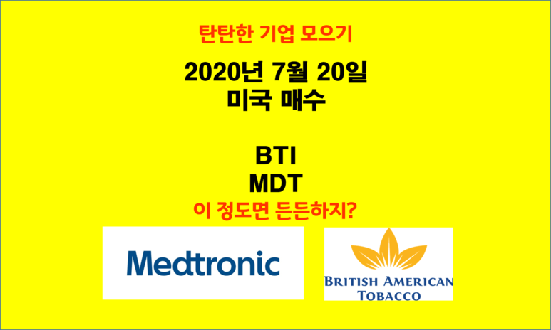 안녕하세요. 오늘도 주식 쇼핑을 했어요! 고민고민 끝에 고른 기업은 바로 담배 가게 최강자 브리티시 아메리칸 타바코(British American Tabacco, BTI)와 의료기기의 최강자 메드트로닉(Medtronic, MDT)입니다.
