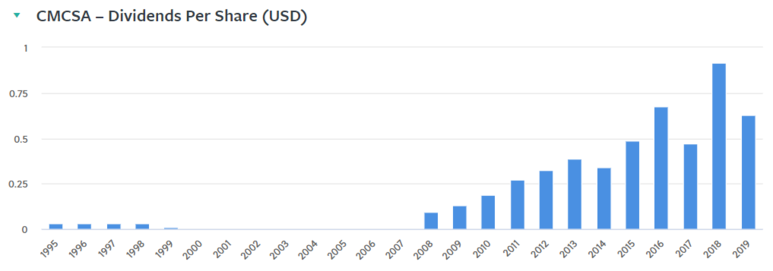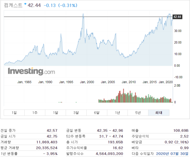 컴캐스트의 배당금은 매년 삭감 없이 지급하지는 않지만 장기간에 갈쳐 꾸준한 상승추세를 보여 줍니다. 실적에 따라 배당금 지급이 조금씩 차이가 있다 보니 오르고 내리지만 주주로서 큰 문제가 되지는 않는다고 생각합니다. 실적이 하락하면 당연히 그에 따라 배당금 지급도 조정이 되는 것이 어찌 보면 기업의 현금 보유에 있어서 긍정적인 영향을 미친다고 생각하거든요.