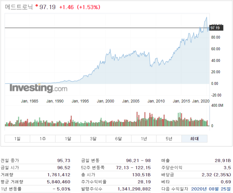 메드트로닉은 현재까지 42년 연속 배당금을 증가시키고 있는 배당귀족주에 포함됩니다. 꾸준한 실적만 계속된다면 배당금도 계속 상승할 겁니다. 좋은 사업구조를 가지고 있는 메드트로닉의 미래는 밝다고 생각합니다. 100년 이상 배당금을 증가시키는 좋은 기업으로 이어갔으면 좋겠네요.