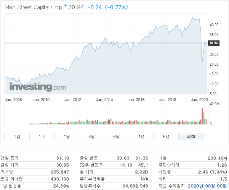 메인스트리트 캐피탈은 월배당을 하는 기업으로 많은 사람에게 인기가 있어요. 매달 들어오는 배당금은 아무래도 주주의 입장에서 좋게 받아들이죠. 마치 월세를 받는 것처럼요.