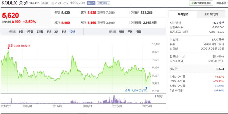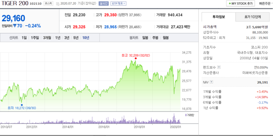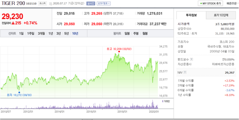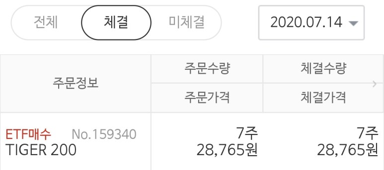 7월은 무엇을 살까 하다가 코스피 200을 추종하는 TIGER200을 7주 매수했다.