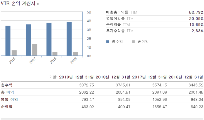 내 생각을 말해보자면 기업의 문제로 발생한 것이 아니었고 현재의 코로나 바이러스로 인한 사회적 거리와 개개인의 가급적인 격리 상황이 이러한 헬스케어 시설에 큰 타격을 주었기 때문에 기업이 무너지지만 않는다면 결국엔 다시 시간이 지나면서 기업의 펀더멘탈을 상승시킬 것이라고 생각한다. 지금 떨어지는 주가와 배당금은 아무런 의미가 없다. 매년 매 분기 실적이 상승하고 이것을 평생 할 수 있는 기업은 세상에 없다.