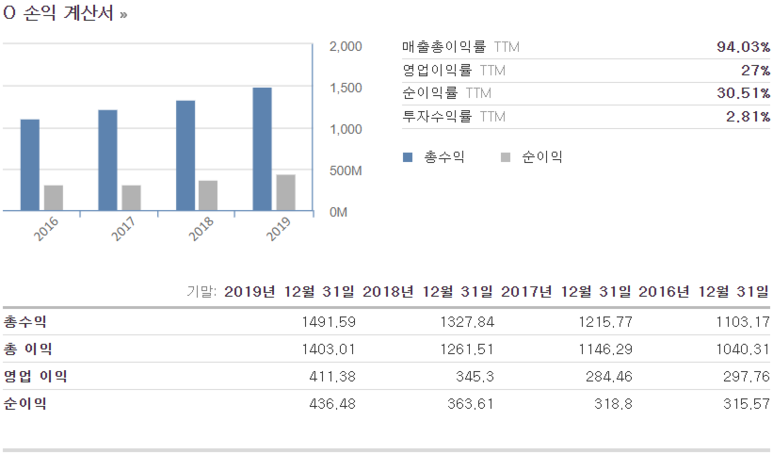 역시나 매출과 영업이익은 꾸준하게 상승하고 있어요. 누가 보면 일부러 그런 기업만 집어서 포스팅하는 거라 생각할 수 있을 만큼 이런 기업이 정말 많아요. ㅋㅋㅋ 한국에도 이런 기업이 있지만 생각보다 미국이 훨씬 많아요.
