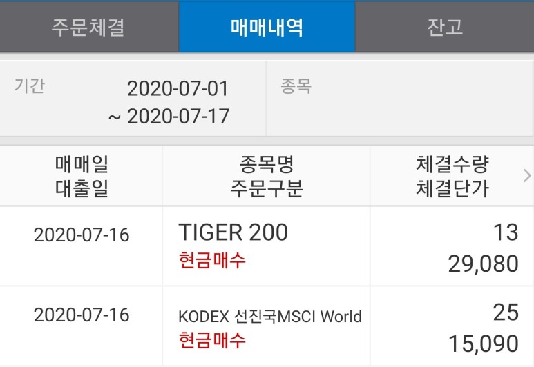 나의 처음이자 마지막 개인연금 계좌에 7월에도 40만을 납입해서 매수했어요. 물론 깜빡하고 저번 달에 매수를 못해서 이번 달은 약 80만 원 정도 매수한 셈이 돼버렸죠. 무엇을 담을까 생각하다가 결국은 우리나라에 투자하는 TIGER200과 미국을 포함한 선진국에 투자하는 KODEX선진국MSCIWorld를 주워 담았어요.