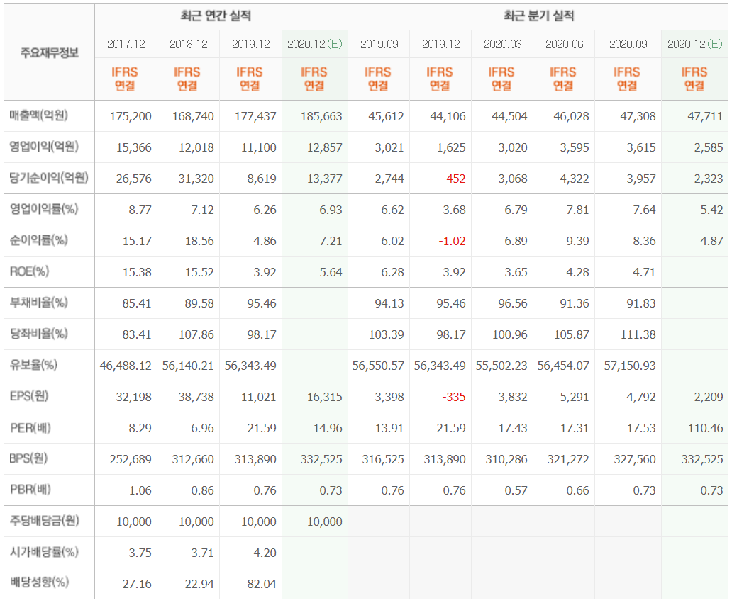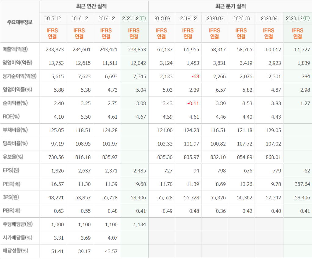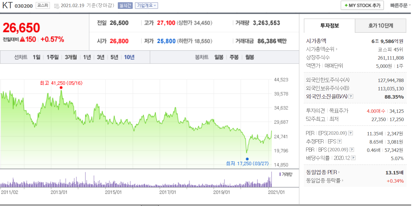 KT는 세 곳의 통신회사 중 가장 높은 시가 배당률을 기록하고 있으나 18년간의 주가하락을 전혀 회복시키지 못하고 있습니다. 기업의 운영진은 주가를 회복시킬 방법을 고안하지 못하고 있기 때문에 이런 기업에 투자하는 것이 조금 고민될 뿐입니다. 그렇다고해서 기업이 가진 능력이 떨어지는 건 아니라고 봐요. 회사의 가치로만 보면 충분히 나쁘지 않은 수익을 거두고 있고 많은 고객을 확보 중이기 때문에 투자처로는 그리 나쁘진 않네요. 물론 장기적인 주가상승을 목표로 투자를 했다면 적합하지 않다고 볼 수 있지요.