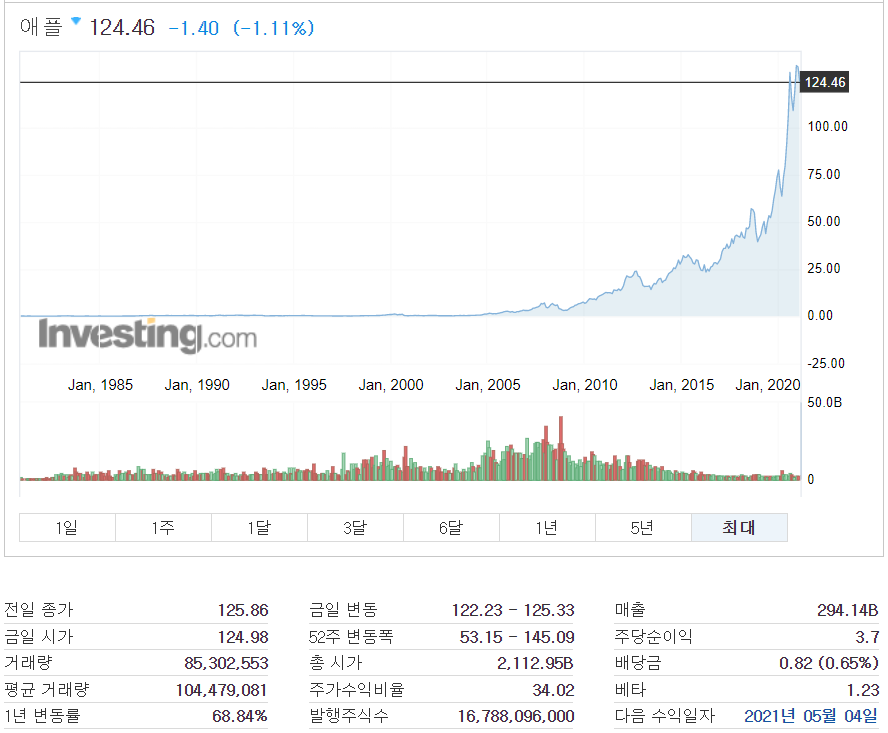 애플의 주가는 정말 많이 올랐습니다. 저는 2019년 초부터 매수하기 시작했는데 그때는 50달러대였어요(액면 분할 전). 믿음이 부족하여 많이 못 담았던 것이 조금 후회가 됩니다. 다시 지금부터라도 모아가는 의미에서 주가가 많이 내려가 주고 있습니다. 다시는 놓치지 않긔!