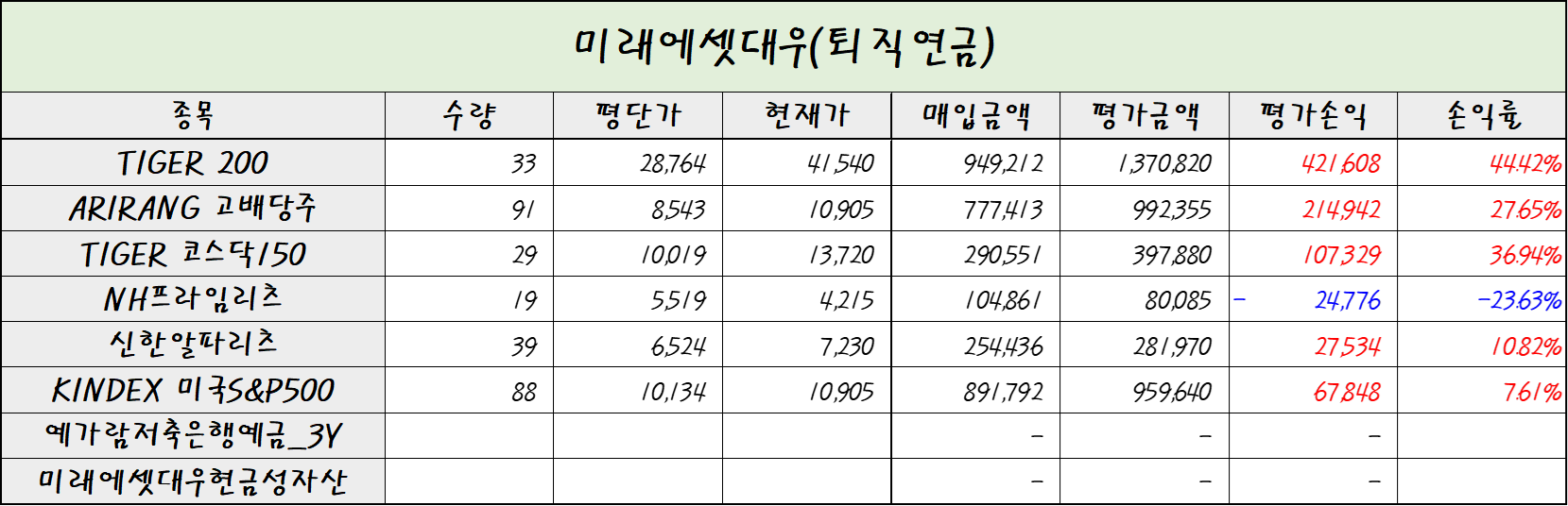 국내 주식형은 코스피200을 추종하는 TIGER 200을 비롯해 코스닥150을 추종하는 TIGER 코스닥150을 기본으로 선택했고 추가로 삼성전자, 삼성SDI를 추가 매수한다는 마음으로 KODEX 삼성그룹을 추가해 주었습니다. 또한 해외 주식형은 미국을 중심으로 선진국 ETF와 중국 ETF를 추가했습니다. 이렇게 포트폴리오를 구성했으니 계속 추가 매수를 하면서 계좌의 사이즈를 불려 나가면 더 이상 연금에는 손을 안대도 되는 것입니다.