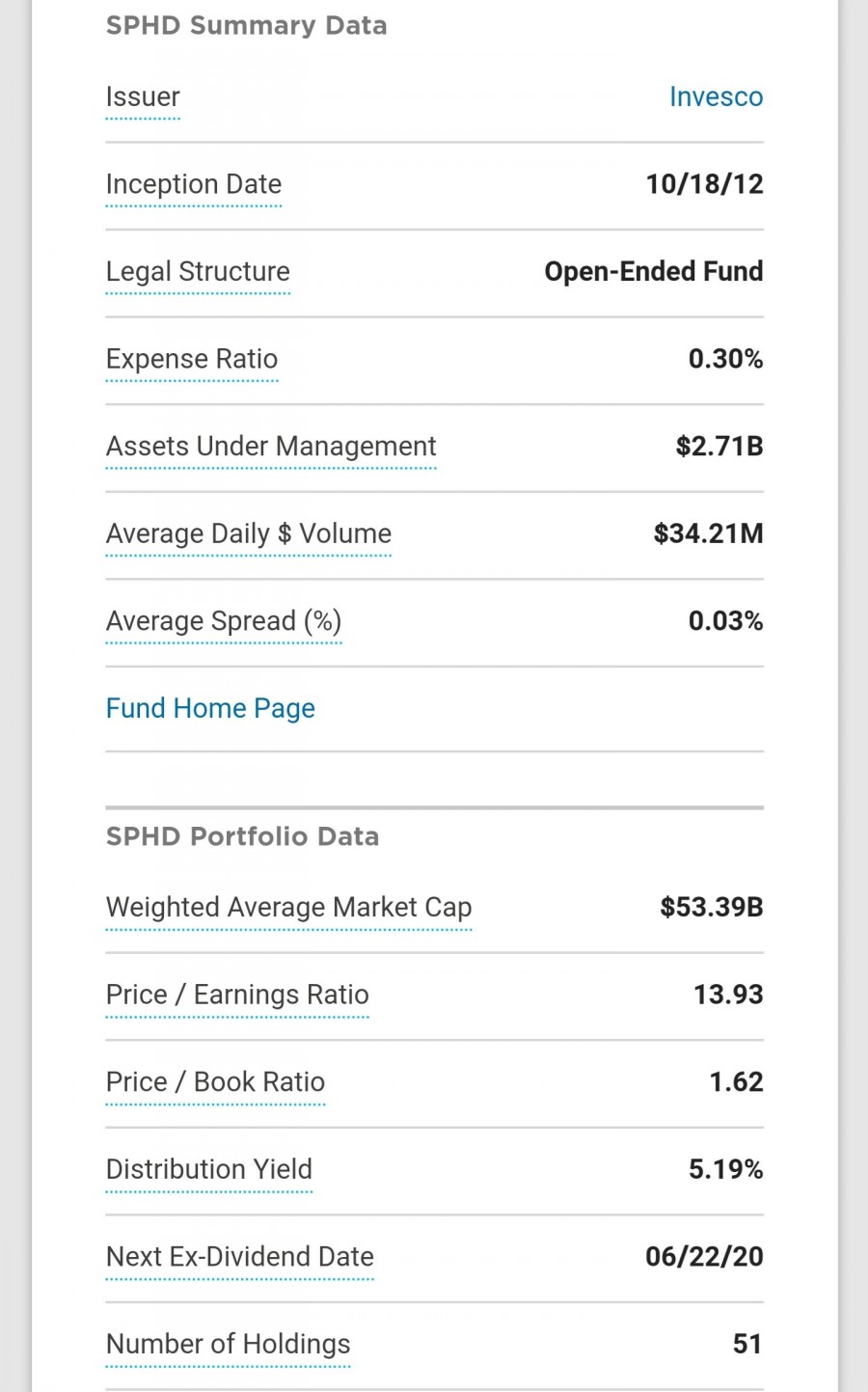 SPHD는 51개의 종목으로 이루어져 있는데 기업들 평균 PER이 14배, PBR이 1.6배으로 보아 비싸지는 않고요. 비교 대상은 미국 기업들과 비교했을 때입니다.