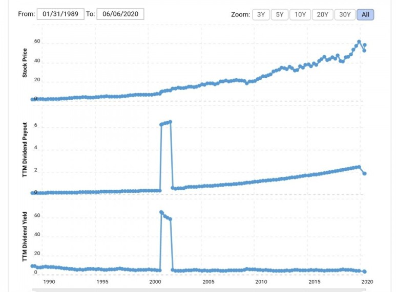 아래 그래프는 주가, 배당금, 배당률을 나타내는데 2001년과 2002년에 급 배당을 올리는데 이유를 알 수가 없군요.