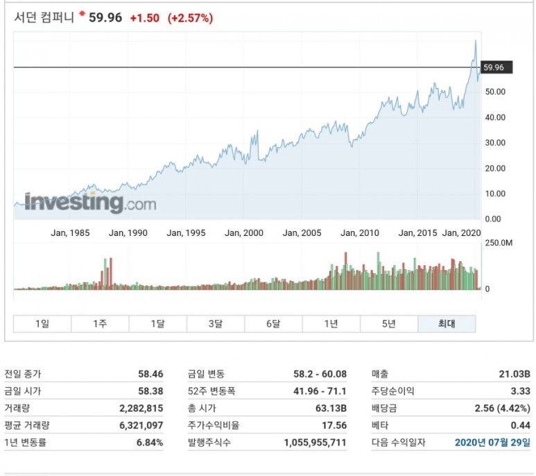서던컴퍼니(Southern company, SO)는 미국의 51개주 중에서 6개주(알라바마, 조지아, 일리노이스, 미시시피, 테네스, 버지니아)에 가스와 전기를 공급하는 76년된 유틸리티(Utility)기업입니다.