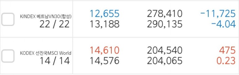 ETF가 은근히 붉은 비율이 더 높네요. 나름 메인으로 이끌고 있는 TIGER200은 플러스로 돌아 섰구요.